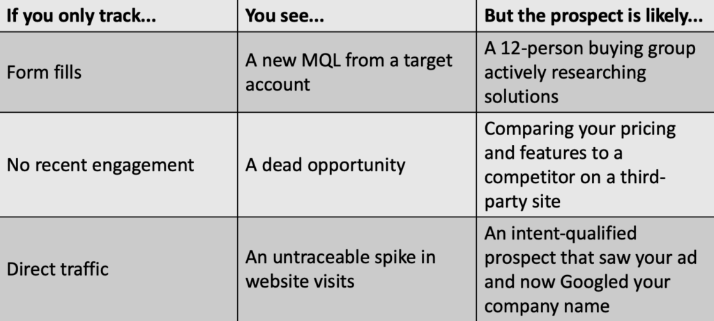 This means they’re skipping research stages, looping around, pausing their research for months, or often entering your “funnel” with mid- to late-stage buyer research signals. If your marketing programs can’t keep up with those jarring research patterns, you’re likely feeding them mismatched messages that don’t align with what they’re looking for, or even worse, trying to wake the dead when they’re not even actively researching.