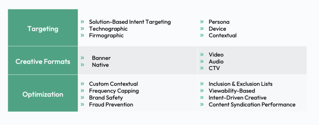 Intentsify’s Ad Solutions offer the flexibility, customization, and scale needed to quickly adapt to evolving buyer journeys and continuously optimize performance.