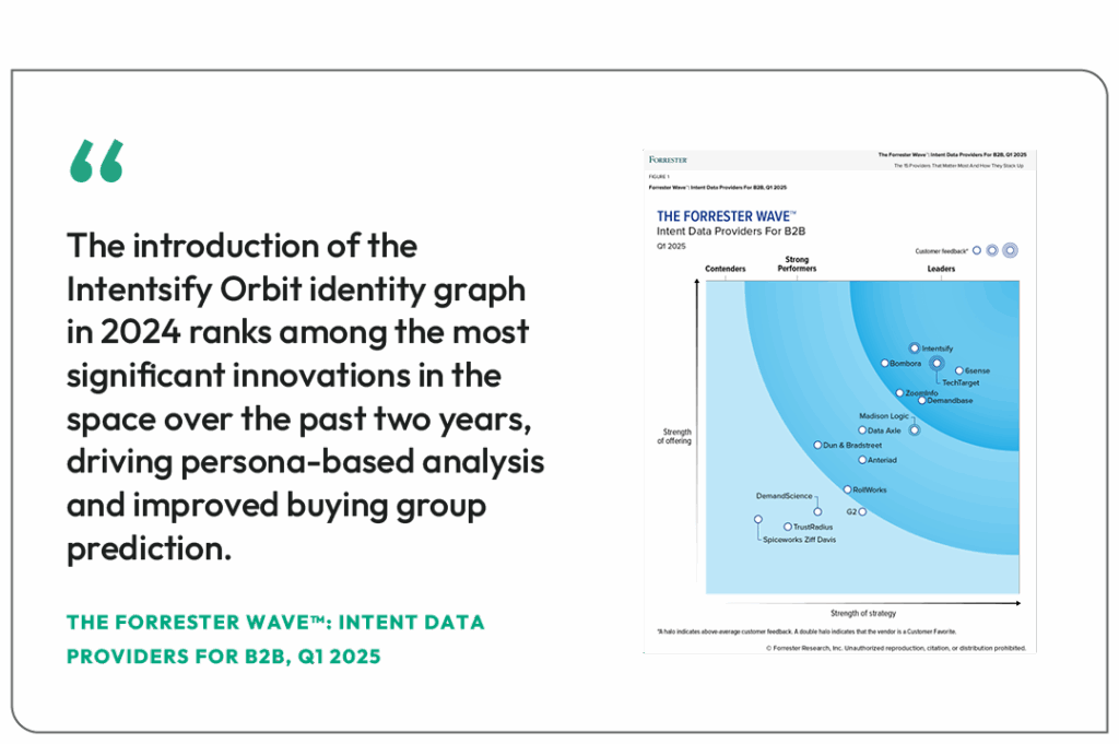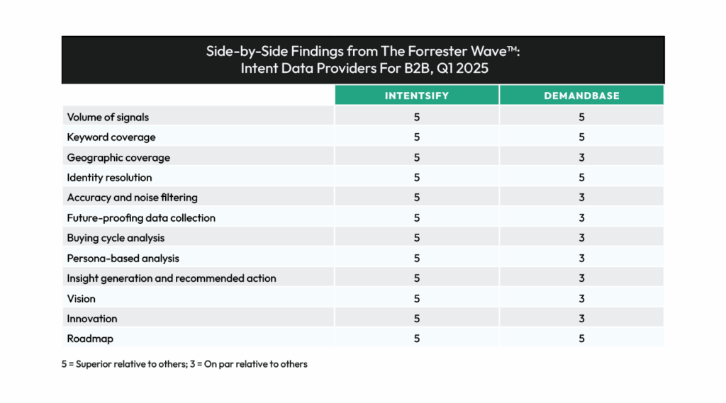 In The Forrester Wave ™: B2B Intent Data Providers Q1 2025 report, Intentsify was ranked #1 for strength of offering and scored higher than Demandbase in 8 categories, including Geographic Coverage, Buying Cycle Analysis, Persona-based Analysis, Insight Generation and Recommended Action, and more.
