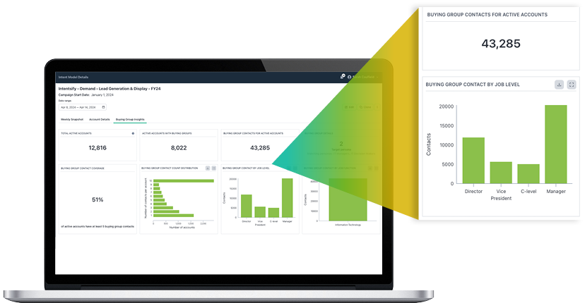 - Effectively engage and convert key buyinggroup members at in-market accounts and accelerate revenue growth at scale by adding on Intentsify’s Buying Group Contact Data.
