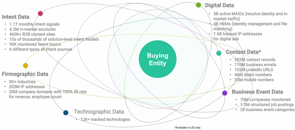 - Power signal-based marketing programs with the industry’s largest identity graph that boasts over 1.1T monthly intent signals and 382M contact records.