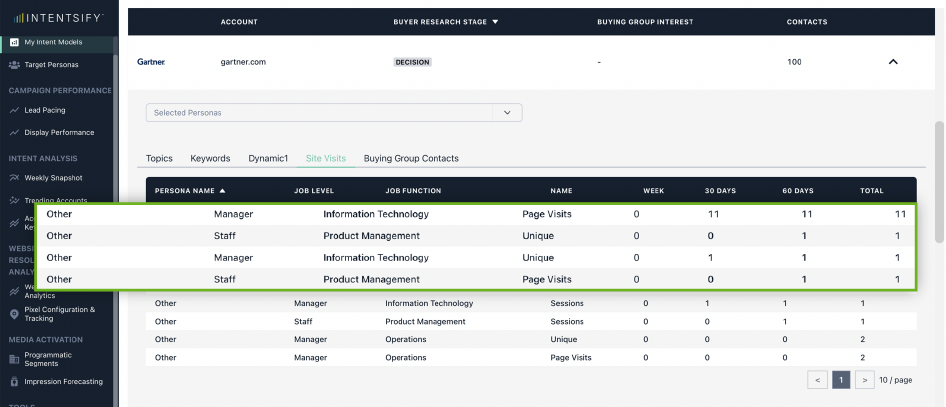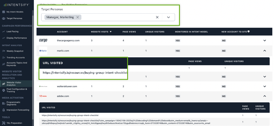 - Get deeper visitor intelligence — Access account and persona-level insights to understand who is browsing your site and what topics, solutions, and products they’re interested in.